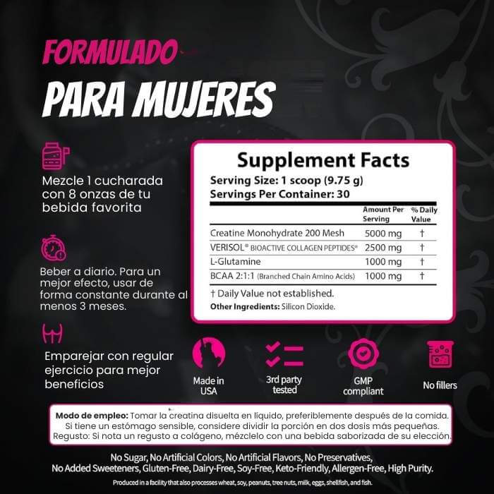 No es la típica creatina. Es una fórmula inteligente que combina rendimiento + estética para mujeres que quieren resultados visibles en glúteos, piernas y piel.