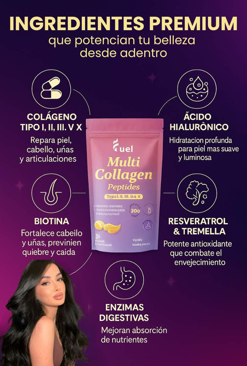 Fuel Multi Collagen Peptides Powder combina 5 tipos de colágeno (I, II, III, V y X) con ácido hialurónico, biotina, enzimas digestivas y probióticos, para nutrir tu belleza y movilidad desde el interior.