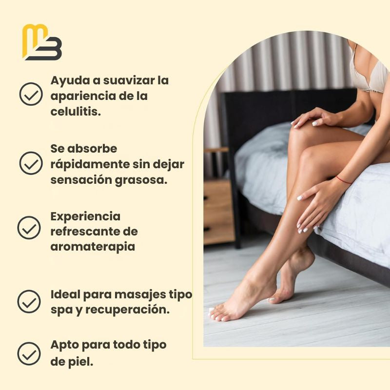 Su textura ligera se absorbe rápidamente mientras hidrata profundamente y mejora la elasticidad. Ideal para muslos, glúteos, abdomen y brazos.
